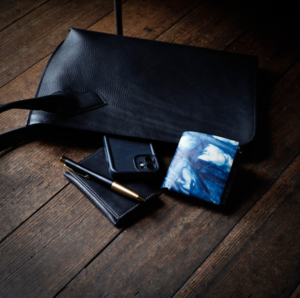藍染めレザーの色味は、光の角度で表情を変え、使うほどに手になじみ、艶が増していきます。